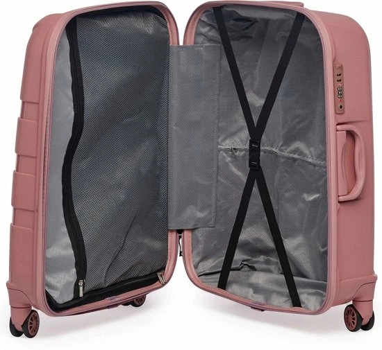 Het design van TROLLEYZ koffers is luxe met een moderne twist. Naast de verstelbare pushbar, krasbestendige buitenkant en 360 graden spinner wheels, mag de binnenkant er ook zijn. De binnenkant van de koffers heeft namelijk een compartiment met inpakriemen om jouw spullen bij elkaar te houden en een met rits afsluitbaar compartiment. Zo weet je zeker dat jouw spullen nergens heengaan tijdens de reis.