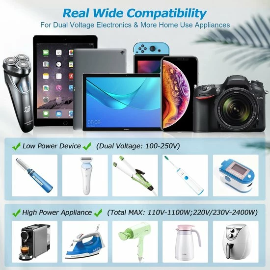 Dit is geen spanningsomzetter, kan het niet helpen om de spanning om te zetten. Dit is alleen een reisadapter voor apparaten met twee voltages. In tegenstelling tot andere reisadapters leveren wij niet alleen apparaten met een laag stroomverbruik. Als u naar 110V-landen reist, zijn elektronische apparaten onder de 1100W toegestaan. In 220V/230V-landen zijn apparaten onder 22222222W toegestaan. De 8-gaats AC-stekker past op meer productuitgangen. Het wordt je perfecte reisgenoot in het buitenland. Elke cent waard!