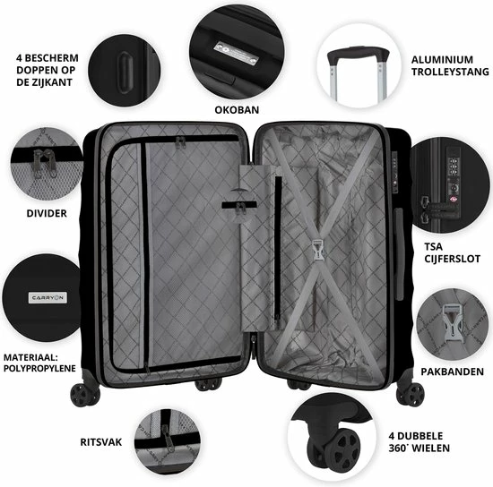 De CarryOn “Porter” is het nieuwe en sportieve model van het Nederlandse merk CarryOn®. Met recht een nieuwe koffer geschikt voor de korte- of wereldreis. Sterk, veilig, betrouwbaar, praktisch en lichtgewicht dankzij het toepassen van de nieuwste technologieën zoals hoogwaardig polypropyleen, aluminium trolleystang, sterke nylon rits, geïntegreerd TSA-cijfercombinatieslot, vier dubbele 360° wielen, het slimme TSA-OKOBAN (een persoonlijke wereldwijde kofferregistratie) en een slim overzichtelijk en praktisch interieur met divider en extra opbergvakjes. Een ideale reisgenoot in vele maten en super sportieve kleuren. Vandaar dat wij op deze serie met een gerust hart 5 jaar garantie kunnen geven.