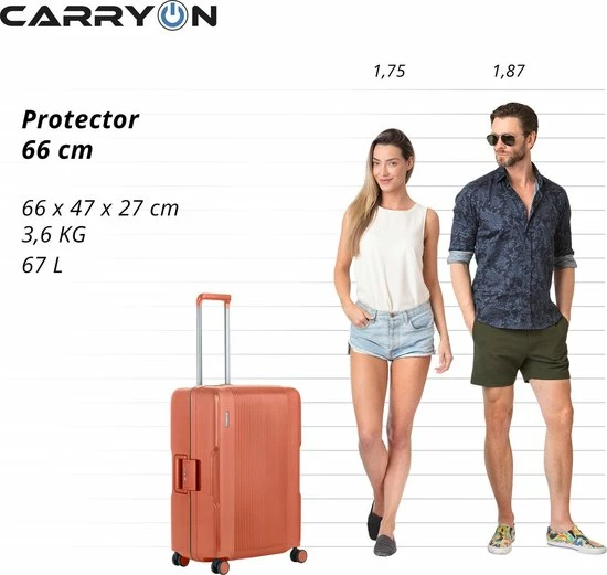De CarryOn Protector is het nieuwste model van het Nederlandse merk CarryOn®. De Protector biedt veiligheid, topkwaliteit, is ontzettend licht voor een koffer met vaste sloten met een groot inpakvolume. Een gratis 4-delige packing cube set voor iedere koffer, bestaande uit een waszak, schoenenzak en twee kleding organizers maken de “Protector’ overcompleet. Ga veilig op reis met het internationale TSA-cijfercombinatieslot, twee extra vergrendelbare kliksloten en een “gratis” TSA-OKOBAN registratienummer om je adresgegevens te koppelen aan je koffer. Vier dubbele 360° soepele geluidlozere wielen, een slim overzichtelijk en praktisch interieur met divider en extra opbergvakken bieden de reiziger een zorgeloze reis. Met een gerust hart durven wij op deze serie 5 jaar garantie te geven.