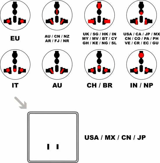 - Kenmerken: Hoge kwaliteit Reisstekker, duurzaam, EU / SG / HK / IN / MY / MV / BT / CY / GH / KE / NG / SL / AU / CN / NZ / AR / FJ / NR / USA / CA / JP / MX / CN / CO / PA / PH / VE / CR / EC / GU / CH / BR / ZA / IT naar USA, vlamvertragend materiaal, Gratis kabel organiser.