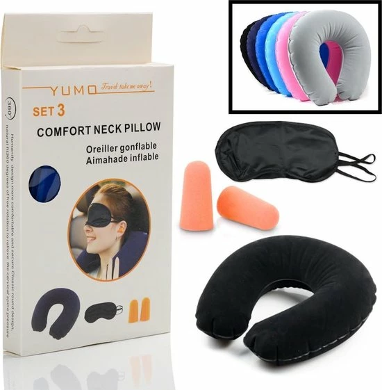3 DELIGE complete Reis SET bestaande uit: Reis Nekkussen, Oogmasker & Oordopjes. Zo dat u comfortabel op reis gaat in het Vliegtuig, Trein, Bus of de Auto.