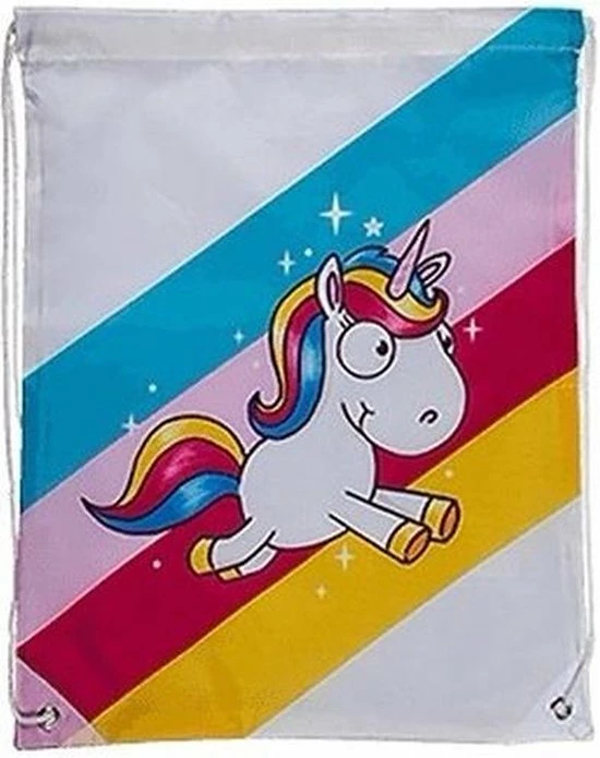 Een wit gymtasje met rijgkoord, bedrukt met een eenhoorn voor een regenboog. Het tasje is gemaakt van polyester en heeft een afmeting van ca. 42 x 34 cm.