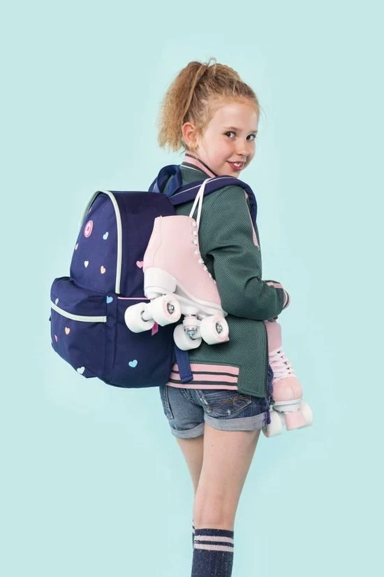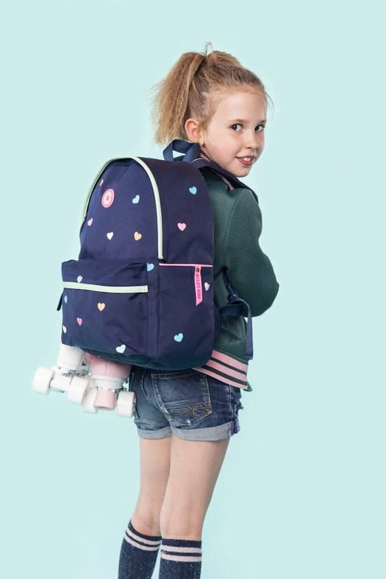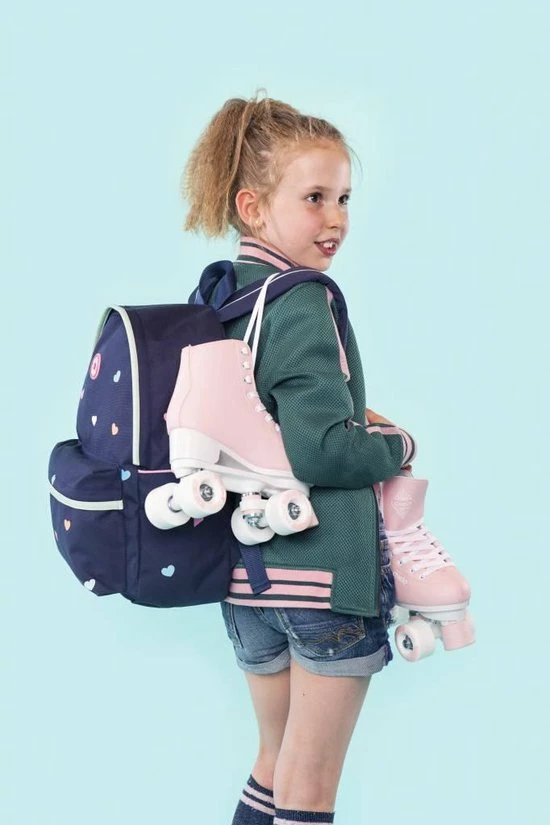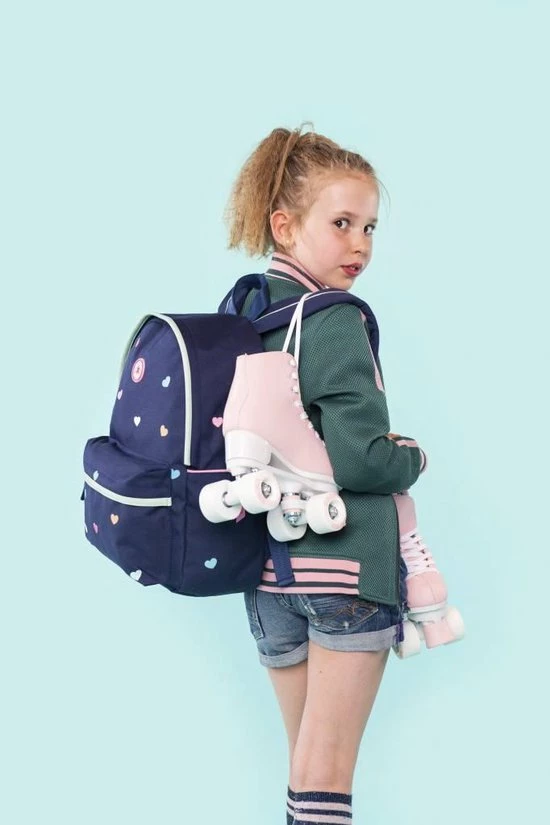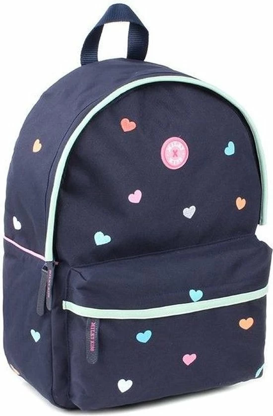 De Milky Kiss Candy Shop rugzak is gemaakt van navy polyester met multicoloured hartjes accenten, heeft een ruim hoofdvak met raincover rits, verstevigd rugpand en een met rits af te sluiten voorvakje. De gefoamde schouderbanden zijn in lengte verstelbaar en dragen hierdoor altijd comfortabel.