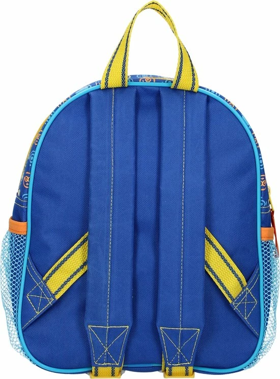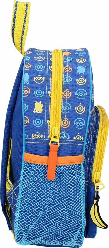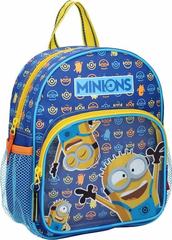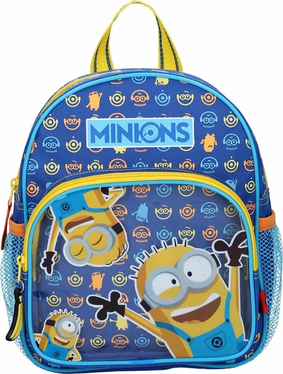 Deze Minions rugzak heeft een vrolijke blauwe kleur en dessin van lachende Minions. De rugzak heeft een ruim hoofdvak waar met gemak alle spulletjes voor een dagje school of uit in kunnen worden meegenomen. Daarnaast heeft de rugzak een klein voorvakje met rits en aan de zijkant twee waterfleszakjes. De gewatteerde schouderbanden zijn in lengte verstelbaar en de tas heeft een lus aan de bovenzijde.
