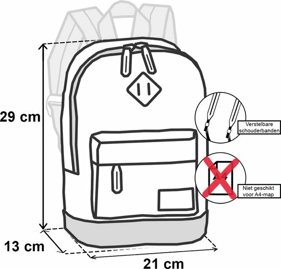 Controleer voor de aankoop de maat die u nodig heeft. Een handige tip is om de rug van uw kind op te meten en te vergelijken met de afmetingen van de rugzak. Let ook op dat tassen aan de bovenkant vaak smaller zijn dan aan de onderkant.