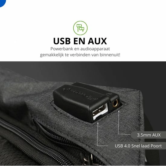 - USB en AUX: Door die ingebouwde USB en AUX poort kan je een audioapparaat of powerbank in de rugzak plaatsen en via de poorten je mobiele telefoon, of oortjes aansluiten!