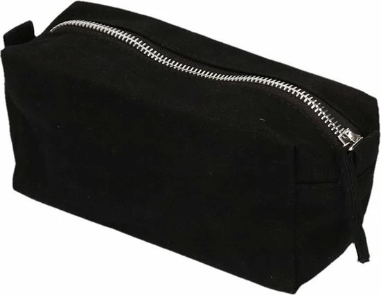 Toilettas/make-up tas zwart 17 cm voor heren/dames. Reis toilettas met ritssluiting. Formaat: 17 x 9 x 7 cm. Inhoud: 1,5 liter. Materiaal: 100% katoen. Handbagage reis accessoires toilettassen/make-up tasjes in de kleur zwart.